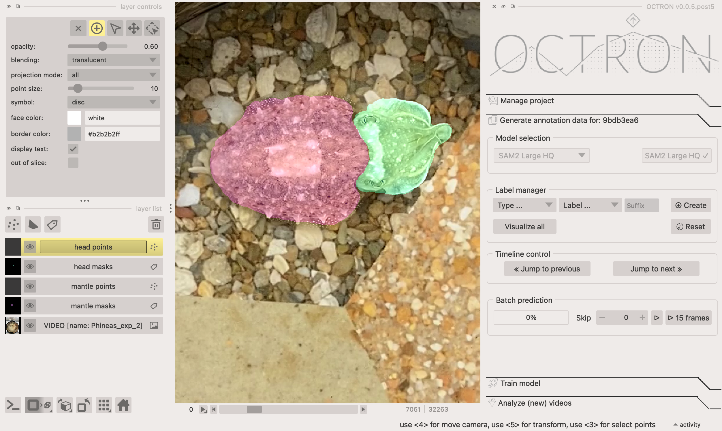 Once you have annotated all the object you want to track in a single frame, you can now get help from OCTRON to annotate the remaining frames by "batch predicting" subsequent frames in the video without having to manually annotate them.